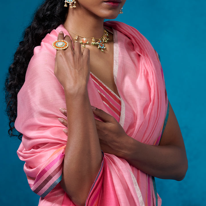 The 'Zahira' blouse features a sleeveless contemporary design with a back opening, silver tissue piping, and a play of pink and orange stripes, making it a versatile and elegant choice for any occasion.