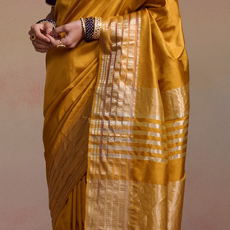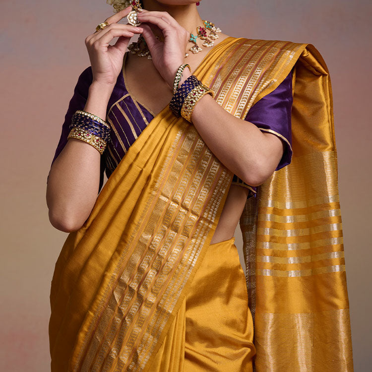 A yellow Maheshwari silk saree featuring silver zari work and subtle purple hints along the borders. The pallu is finished with Dressfolk signature charm and glass beads, adding gentle shimmer. Perfect for festive occasions, rituals, and celebratory evenings.